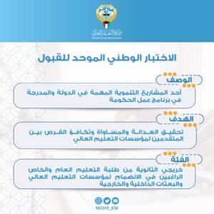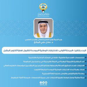 وذكر المانع أن الاجتماعات التنسيقية وضعت آلية تنفيذ وتطبيق الاختبار الوطني الموحد للقبول لخريجي الثانوية الراغبين في التقدم للتخصصات الطبية والهندسية في البعثات الخارجية والداخلية «كمرحلة أولية»، وسيكون اختبار القدرات في مجالي اللغة الإنجليزية والرياضيات ، كما يمكن معادلة نتائج الاختبارات العالمية الآيلتس والتوفل باللغة الإنجليزية ومقارنتها بالمعدل المكافئ، مع استمرار تطبيق اختبار القدرات للراغبين في التقدم لجامعة الكويت على ما هو معمول به سابقا، موضحا أنه سيتم إسناد مهمة إعداد وتجهيز وإدارة الاختبارات الوطنية الموحدة لجامعة الكويت، واعتماد الأوزان المحددة والمعتمدة بالجامعة للاختبارات الوطنية لاحتسابها ضمن المعدل المكافئ.