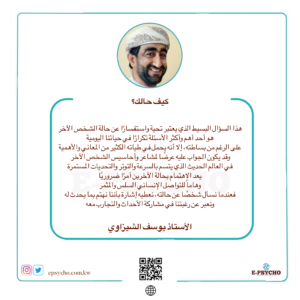 إيسايكو: كيف حالك؟ بقلم الأستاذ يوسف الشيزاوي هذا السؤال البسيط الذي يعتبر تحية واستفسارًا عن حالة الشخص الآخر هو أحد أهم وأكثر الأسئلة تكرارًا في حياتنا اليومية. على الرغم من بساطته، إلا أنه يحمل في طياته الكثير من المع