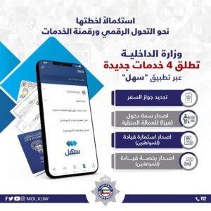 وزارة الداخلية تعلن عن اطلاق 4 خدمات جديدة عبر التطبيق الحكومي الموحد للخدمات الإلكترونية “سهل” وذلك في خطواتها نحو استكمال عملية التحوّل الرقمي ورقمنة خدمات الوزارة المقدّمة للجمهور.