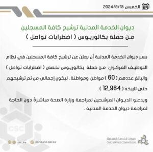 الكويت (كونا): أعلن ديوان الخدمة المدنية اليوم الخميس ترشيح كافة المسجلين في نظام التوظيف المركزي من حملة بكالوريوس تخصص (اضطرابات تواصل) والبالغ عددهم 60 مواطنا ومواطنة ليصبح إجمالي من تم ترشيحهم حتى اليوم 12964 مواطنا ومواطنة.