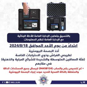 قامت الإدارة العامة للأدلة الجنائية بالتعاون والتنسيق مع الإدارة العامة لنظم المعلومات بتوفير أجهزة البصمة البيومترية المتنقلة لأخذ البصمة لهم في مقارهم ابتداءً من يوم الأحد الموافق 2024/8/18.