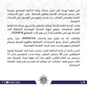 الجدير بالذكر أن وزارة الداخلية قامت بتمديد فترة إجراء البصمة للإخوة المواطنين حتى 30 سبتمبر المقبل، بينما مددت للمقيمين حتى 31 ديسمبر من العام الحالي، لتكون هذه آخر مهلة لإجراء البصمة، بعد ذلك، سيتم وقف معاملات كل مواطن أو مقيم لم يقم بإجراء البصمة البيومترية.