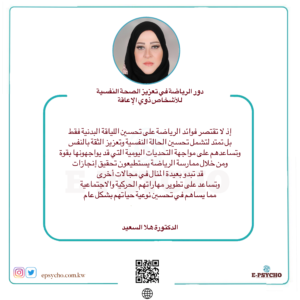 إيسايكو: دور الرياضة في تعزيز الصحة النفسية للأشخاص ذوي الإعاقة … بقلم الدكتورة هلا السعيد السلام عليكم ورحمة الله وبركاته بحكم تخصصي كمعالجة نفسية ومدير العام لمركز الدوحة العالمي للاشخاص ذوي الاعاقة حبيت ان اسلط الض