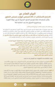 كما شدد المجلس الوزاري على وجوب إحترام العراق لسيادة دولة الكويت ووحدة أراضيها والالتزام بالتعهدات والاتفاقيات الثنائية والدولية وكافة قرارات الأمم المتحدة ذات الصلة وخاصة قرار مجلس الأمن رقم 833 (1993م) بشأن ترسيم الحدود الكويتية -العراقية البرية والبحرية ودعا إلى استكمال ترسيم الحدود البحرية بين البلدين لما بعد العلامة البحرية 162 وفقا لقواعد ومبادئ القانون الدولي وإتفاقية الأمم المتحدة لقانون البحار لعام (1982).