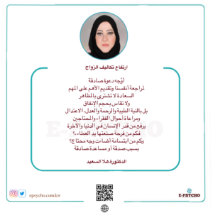 إيسايكو: ارتفاع تكاليف الزواج … بقلم الدكتورة هلا السعيد المجتمع يواجه مشكله كبيرة ارتفاع تكاليف الزواج وحيث لها توابع واثار اجتماعيه واقتصاديه ونفسيه بعيدة المدي تؤثر على الفرد والمجتمع ككل. ومن اهم هذه الاثار السلبي